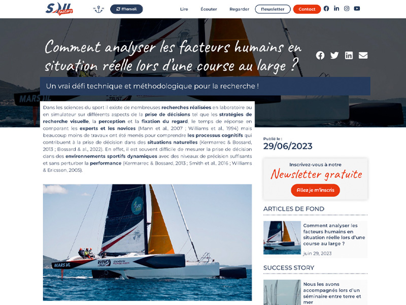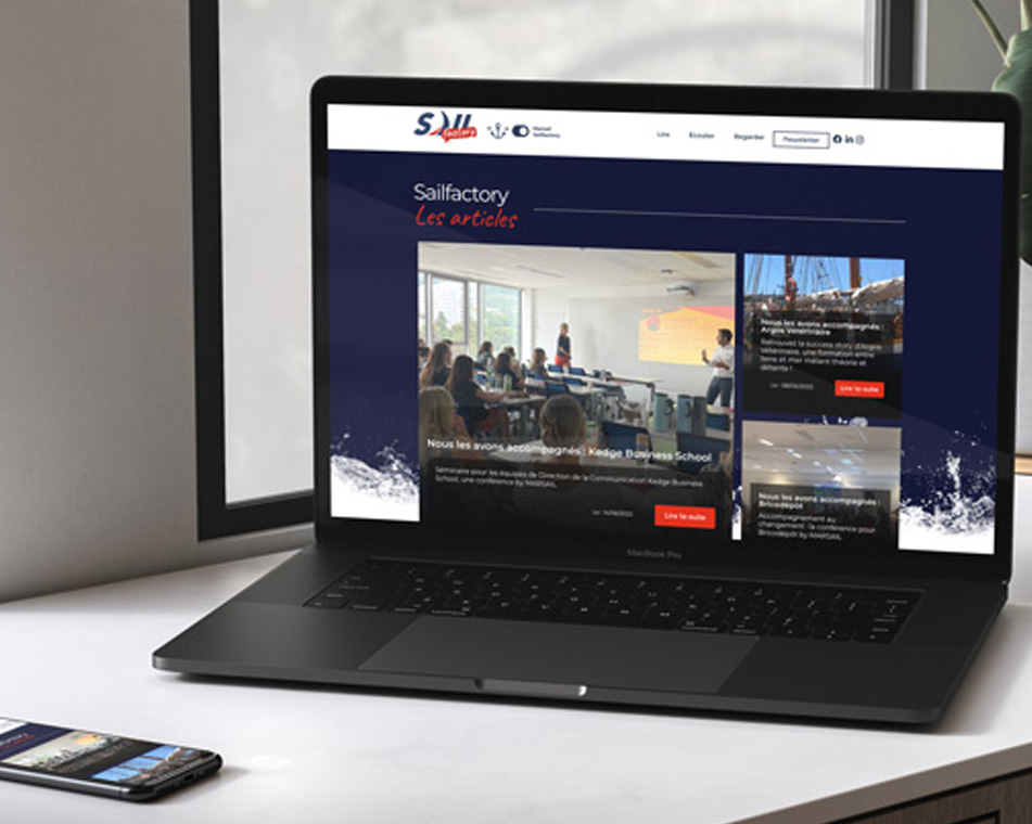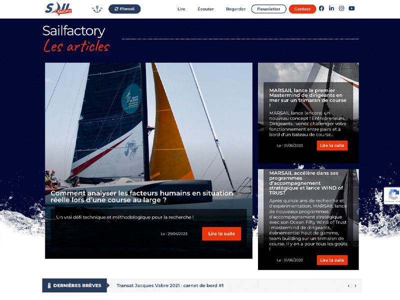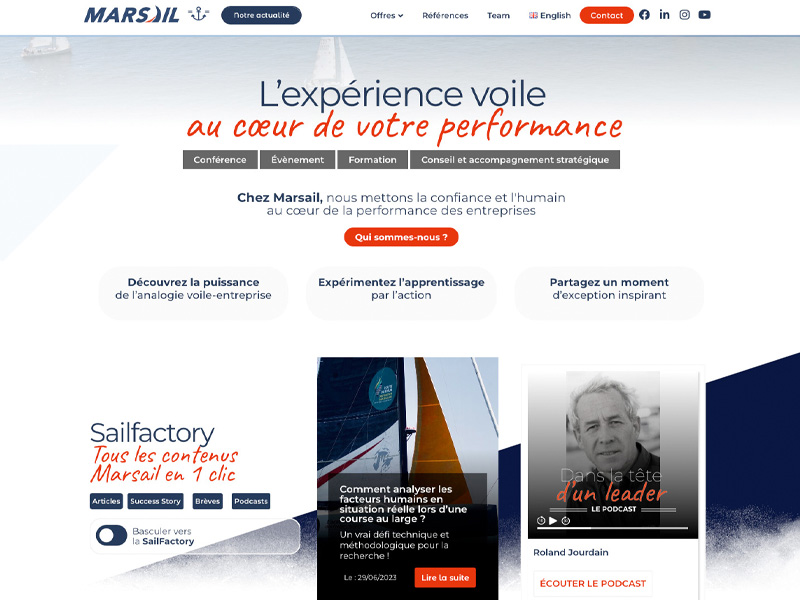 Afin d’élargir sa portée et toucher un public plus large, MARSAIL a opté pour une collaboration avec La Fab’ pour la création d’un site vitrine personnalisé qui met en avant les compétences de MARSAIL, mais également ses actualités au sein de la Sailfactory, qui référence différents articles et podcasts.